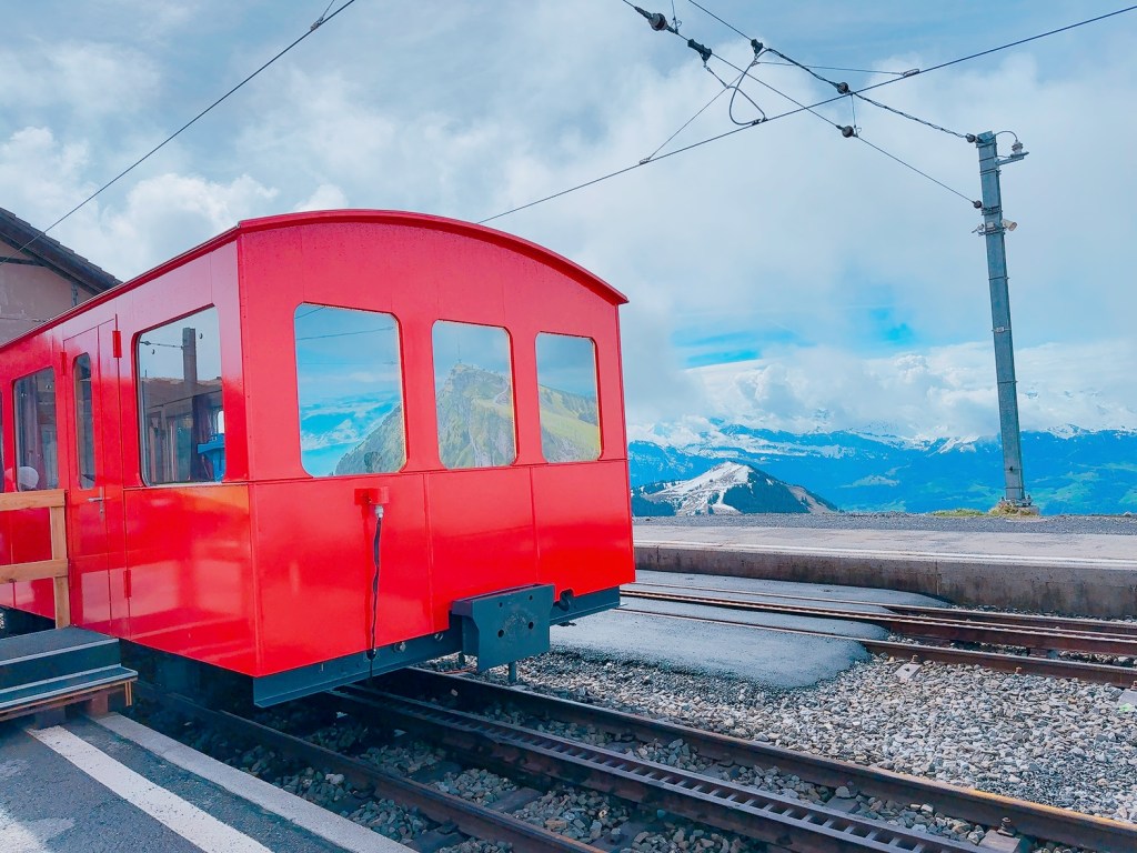 過了天橋,便會看到一些很漂亮的藍色登山纜車(RIGI MOUNTAIN RAILWAYS),這就是歐洲最悠久的山地齒軌鐵路。在車站,看着藍天白雲,十分興奮,因為昨天上山天氣都不太好。