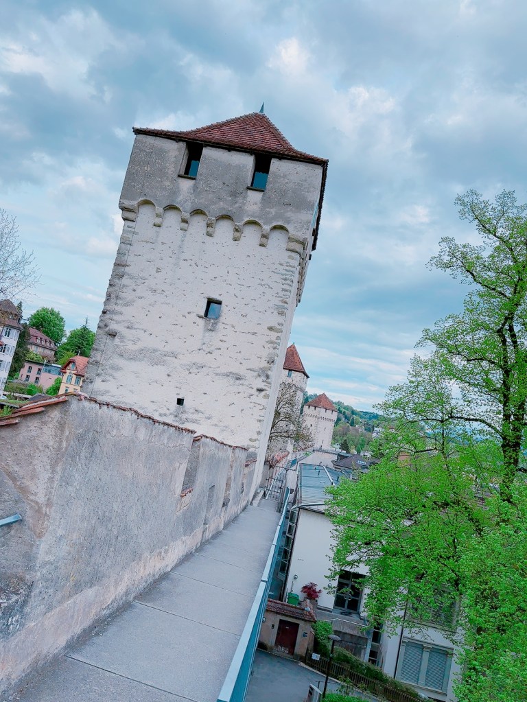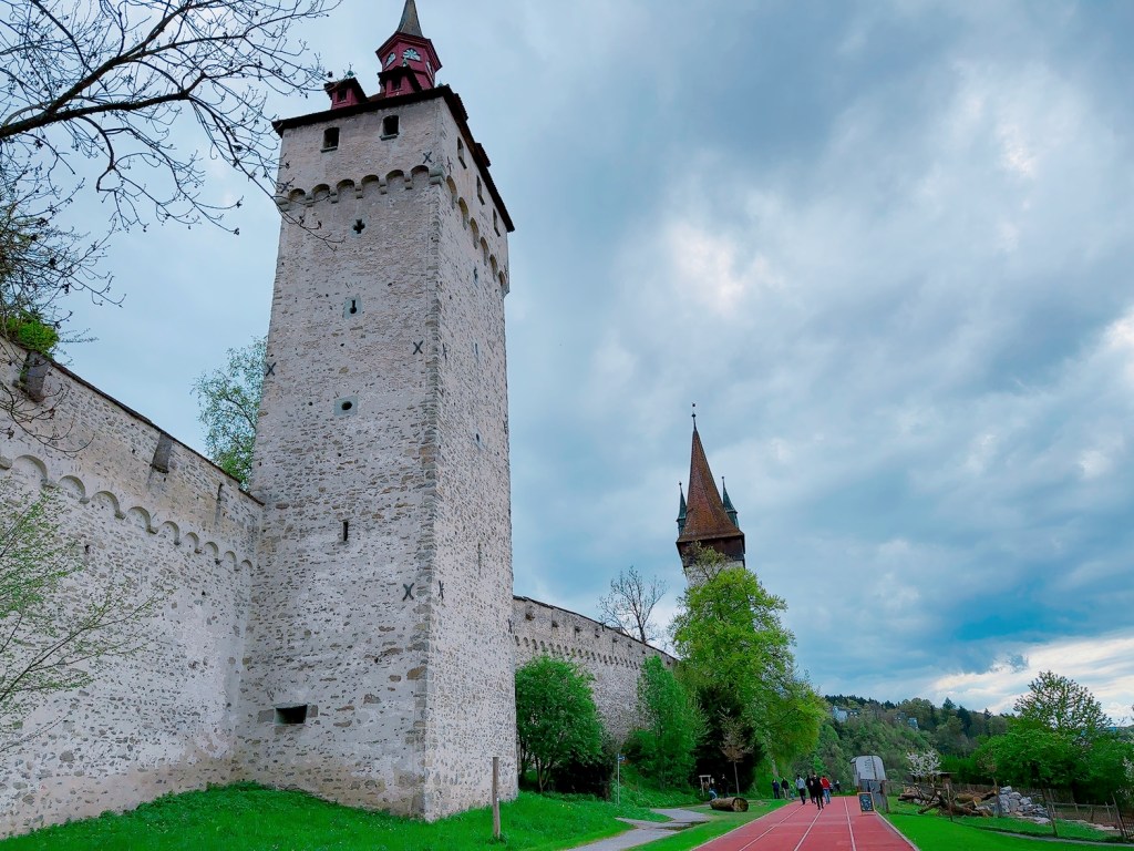 下一站我們到 (穆塞格城牆 Museggmauer)遊覽一下,這裏有很多個守望塔、鐘塔和花園,但不是所有塔都開放,我們選了大鐘樓上去看看。