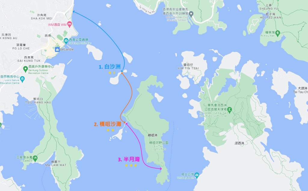 新手們可以由沙下碼頭撐獨木舟前往白沙洲玩樂後折返碼頭(路線1)、或前往橋咀沙灘和天使之路打卡玩樂一下(路線2),橋咀沙灘有士多和洗手間作補給(但洗手間的水是鹹水XD)